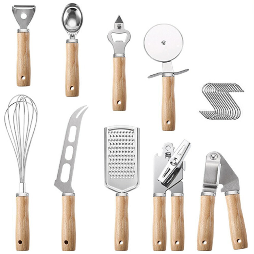 Dale un toque profesional y elegante a tu cocina con este set completo de 12 utensilios, que combina la resistencia del acero inoxidable con la calidez del mango de madera. Un kit versátil y duradero, pensado para cubrir desde la preparación diaria hasta la repostería y los postres caseros.